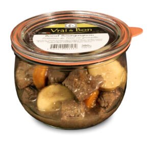 Viande de bœuf origine France 31%,eau, carottes, pomme de terre 28%, vin rouge 8% (contient sulfites), amidon de maïs, échalotes, fond brun (contient gluten), sel, poivre.